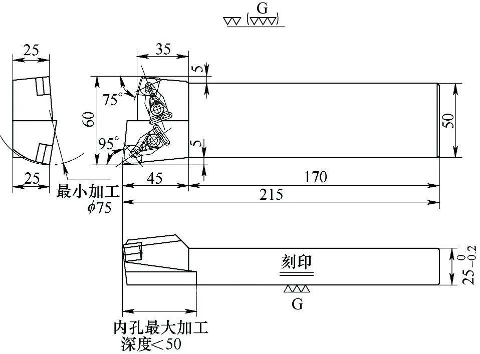 1)刀体长宽为170mm×60mm,由四方刀台上3个紧固螺栓固定,因此刀体强度高,装夹稳定,抗振性好。通过试验对比发现,此刀具适合大切削量加工,切削次数由原来的两次提升为一次,有效提高了加工效率,且零件表面质量稳定。