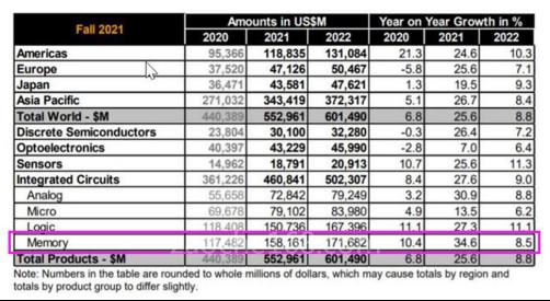 J.P. Morgan, Gartner and Deloitte等主要行业分析机构的分析师都预测了半导体产能的短缺将持续整个2022年,甚至更长。根据WSTS的数据分析,2022年全球存储器件市场的规模将达到1716.82亿美元,较之前预估的2022年增加135.21亿美元,同比增长将会达到8.5%。