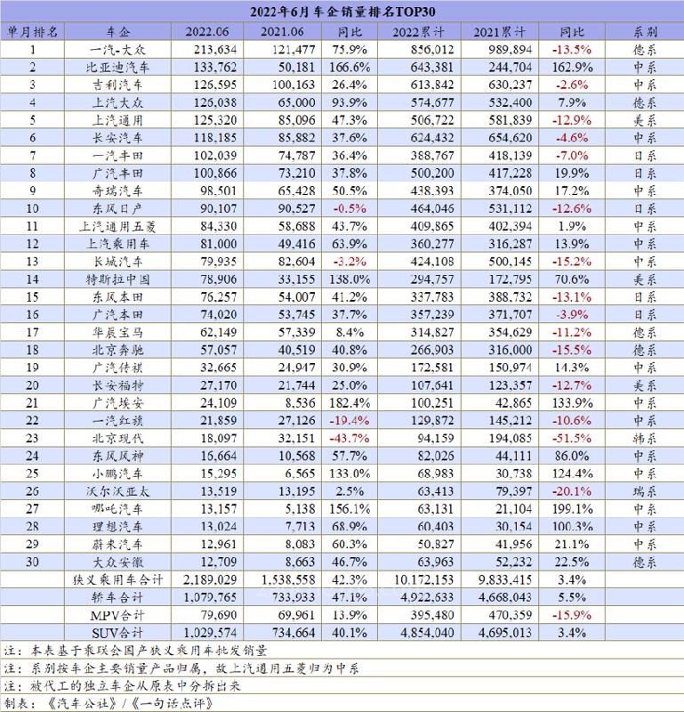 此外,一个重要的节点是,从4月份疫情开始,车市发生了翻天覆地的变化,以比亚迪为代表的自主品牌,单月占据了56.1%的市场份额。继2022年2月份自主品牌市场份额突破50%之后,再次创下自主品牌份额占比的新纪录。同时,也推动着自主品牌1~6月的市场份额达到了46.6%。