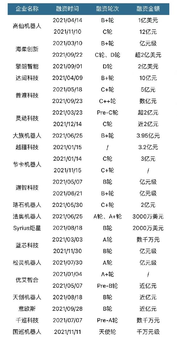 劳动力结构变化、产业升级、政策支持等因素长期驱动移动机器人行业发展,该行业长期向好的基调不变,投资人兴趣只增不减。2017-2021年国内移动机器人行业投资额逐年攀升。尤其是2021年行业内融资事件、融资金额实现显著双增长,分别为38起、47亿元,较2020年同期分别增加24起、25亿元。资本真金白银的入场会给移动机器人行业带来充足信心,也使行业市场化进程提速。从下图可以看出,2021年多家移动机器人企业进行了大额融资,部分企业甚至年度内进行了两轮融资,且融资额过亿。
