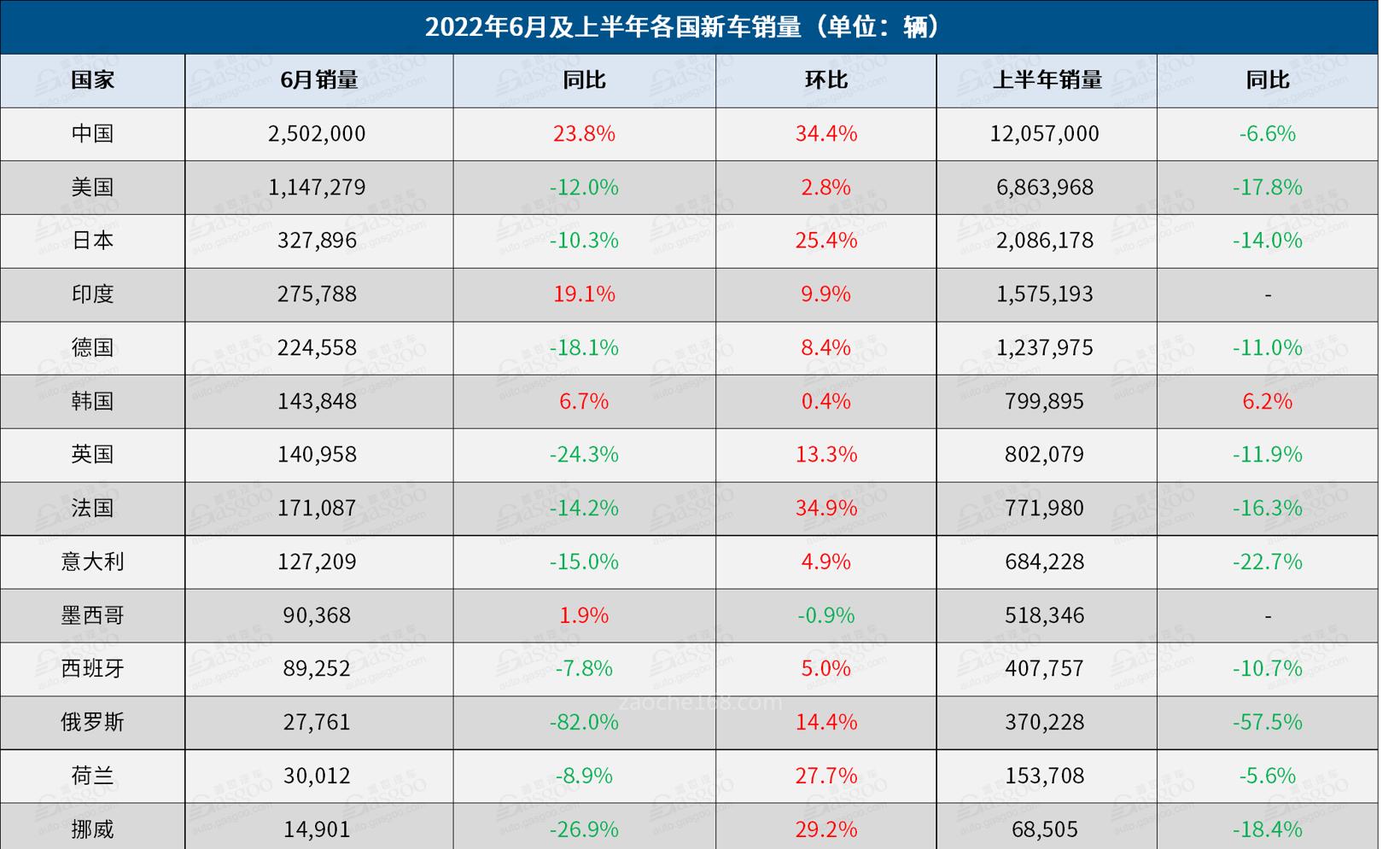 纵观全球车市,6月份,中国、韩国、印度和墨西哥的汽车销量实现了同比增长,其余车市的销量状况并不乐观。此外,由于新冠疫情蔓延和供应链受限等不利因素的影响,全球车市上半年的销量普遍下跌,但中国车市的销量仍突破一千万辆,同比仅下跌6.6%。中国车市未来很有可能恢复增长,但美国和欧洲各国恐怕难以挽回跌势。