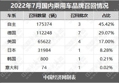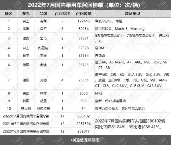 根据国家市场监督管理总局缺陷产品管理中心7月发布的召回公告,中国经济网汽车频道经过汇总、统计,整理出“2022年7月国内乘用车召回榜单”。7月,共有10个汽车品牌累计发布16起公告,共计召回乘用车386102辆,同比下降81.24%,环比增长66.41%。