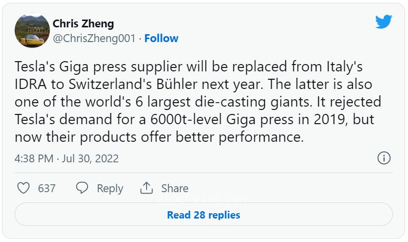 据外媒报道,到目前为止,特斯拉只向一家供应商采购Giga压铸机——意大利IDRA,但知情人士透露,从明年开始,特斯拉将转向一家新的压铸机制造商——瑞士Bühler。