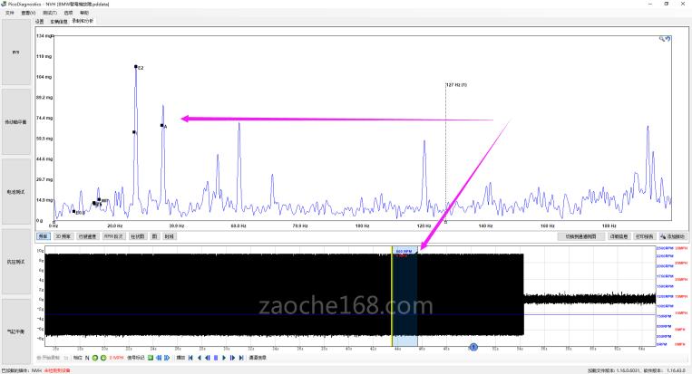一辆 BWM Z3,搭载M44引擎,引擎运行时有明显异音,拆除外部皮带后异音消除,怀疑是发电机轴承磨损产生异音,但用手转动发电机轴承手感无明显异常,因此技师决定采用NVH检测确认是否为发电机为噪声源。