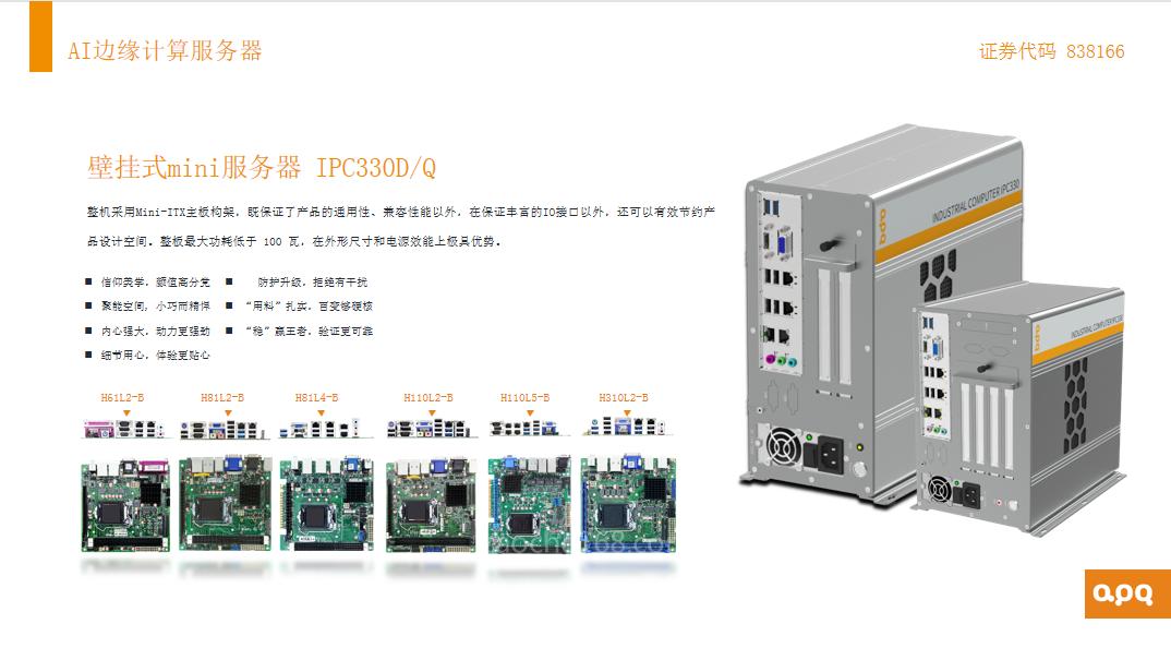 IPC330系列是一款稳定可靠的Al边缘计算服务器,适配所有ITX主板进行紧凑设计,壁挂式及桌面式安装方式适用于各种使用场所。同时结合阿普奇模块化设计理念,通过简单的模块组合,结合扩展卡转接槽,可进行自由灵活扩展,形成不同接口、不同性能的多种产品,可广泛应用于通信、金融、电力、交通、医疗、工业自动化等各领域。