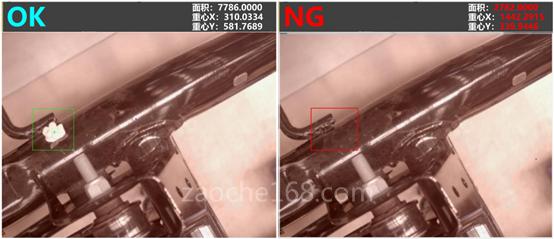 除了边缘位置计算之外,亦可通过观察颜色面积,例如图中的白色卡子,首先定义正确安装状态下白色面积的大小。之后的每一个,都观察并对比画像中白色所覆盖的面积值,一旦出现偏差则说明卡子并未安装到位,判断为NG。