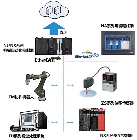 1、通过欧姆龙的NJ/NX系列作为逻辑控制系统,与TM协作机器人进行通讯指挥检查工作。