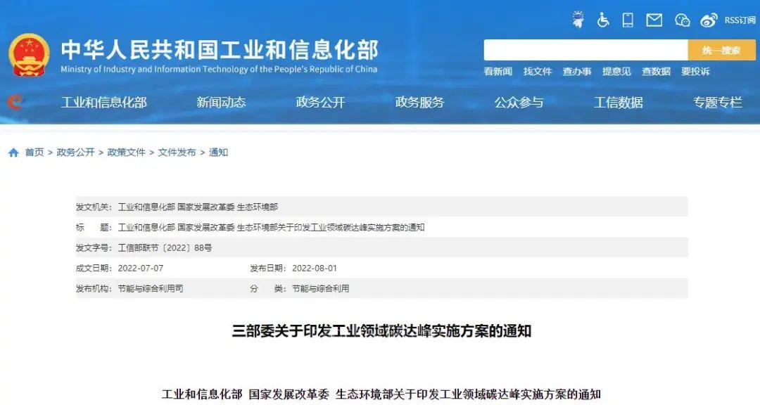 8月1日,工业和信息化部、国家发展改革委、生态环境部近日联合印发《工业领域碳达峰实施方案》,提出“十四五”期间,产业结构与用能结构优化取得积极进展,能源资源利用效率大幅提升,建成一批绿色工厂和绿色工业园区,研发、示范、推广一批减排效果显著的低碳零碳负碳技术工艺装备产品,筑牢工业领域碳达峰基础。“十五五”期间,产业结构布局进一步优化,工业能耗强度、二氧化碳排放强度持续下降,努力达峰削峰,在实现工业领域碳达峰的基础上强化碳中和能力,基本建立以高效、绿色、循环、低碳为重要特征的现代工业体系。确保工业领域二氧化碳排放在2030年前达峰。