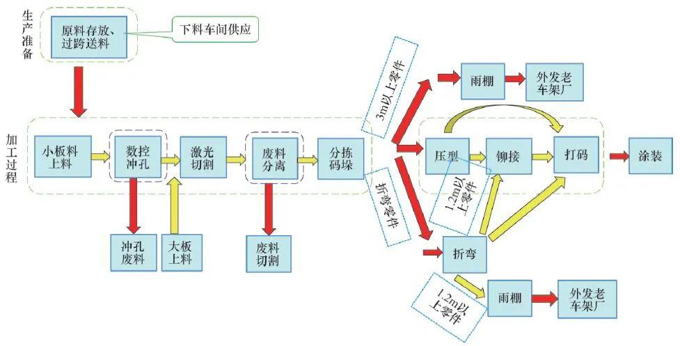 车架零部件传统生产模式存在如下问题:①材料利用率低。②产品制孔外形切割方面一致性较差。③零件生产过程磕碰划伤较大。④装配时存在孔位不正等质量缺陷。⑤工序间转运频繁。⑥作业人员工作效率低,生产成本高。
