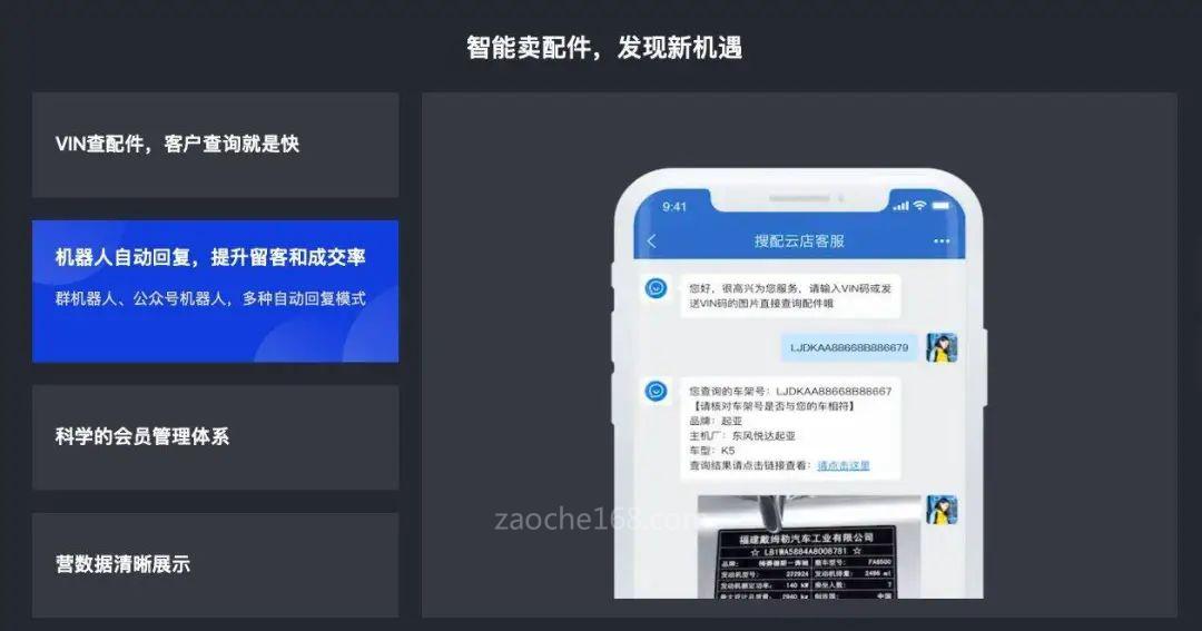 汽配经销商,不需要花费大量的人力来解决下游汽修厂的查询需求,只需要教汽修厂的将车主的车架号发给搜配智能机器人即可,再将合适的配件订单发给经销商,汽配经销商即可安排发货,整个的交易环节变得很简单,汽修厂也无需在等待汽配商返回配件适配情况,自己查询就可以了。