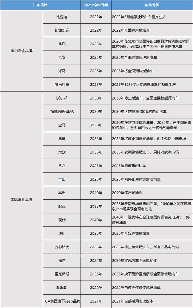 为支持环境保护和顺应汽车行业发展趋势,近年来国内外汽车企业陆续对外宣布停产停售燃油车时间表,电车资源梳理统计如下:
