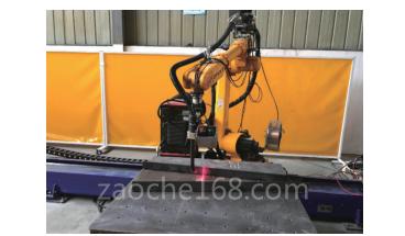 重磅板产品的焊缝轨迹为圆弧,坡口角焊缝且为多层多道焊接。根据产品的焊接特性,我公司开发的重磅板圆弧焊接专机如图1c所示。此专机包括行走轴、焊接设备、相机拍照和线激光以及上位机控制系统,集成了相机拍照传感器,可以根据相机拍照识别工件,生成圆弧轨迹,并且通过线激光传感器来纠正焊枪运动轨迹,保证焊接焊缝的一致性,确保了焊接质量。大厚度管道埋弧焊焊接如图1d所示。此焊接专机集成了埋弧焊接设备、旋转变位机、X行走轴、机器人和弧焊焊接设备等。工作顺序为外部设备控制变位机旋转,机器人弧焊焊接设备对工件进行打底焊接,而后采用埋弧焊进行填充盖面焊接。