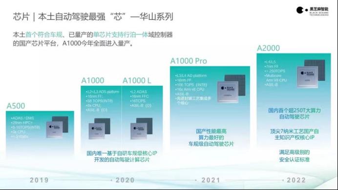 黑芝麻智能就在这一大背景下孕育而生,其在2016年成立,2020年发布了第一代芯片;2021年推出了最新的A1000系列芯片,并预计在今年年底推出新一代A2000芯片。同时,下一代A3000芯片也已经着手推进,预计采用5nm制程,拥有超过1000Tops的算力水平,足以与海外品牌的芯片旗舰“掰手腕”。