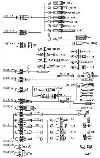 TSG82工具系统是与数控机床,特别是与加工中心配套的辅具。该系统包括多种接长杆、联接刀柄(镗、铣刀柄,莫氏锥孔刀柄,钻夹头刀柄,攻螺纹夹头刀柄,钻孔、扩孔、铰孔等类刀柄)、镗刀头等少量的刀具。用这些配套,数控机床就可以完成铣、钻、镗、扩、铰、攻螺纹等加工工装。TSG82工具系统各种辅具和刀具具有结构简单、紧凑、装卸灵活、使用方便、更换迅速等特点。我国TSG工具系统就属于整体式结构的工具系统。它的特点是将锥柄和接杆连成一体,不同品种和规格的工作部分都必须带有与机床相连的柄部。其优点是结构简单,使用方便、可靠,更换迅速等。缺点是锥柄的品种和数量较多。图2所示是TSG82工具系统图谱,选用时一定要按图示进行配置。表8-3是TSG82工具系统的代码和意义。