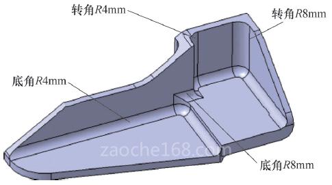 1)零件的内槽和缘条之间的转角大小以及内槽和腹板之间的底角大小决定了刀具的选择,将直接影响零件的加工工艺性。零件底角和转角尺寸如图2所示,底角有R4mm、R8mm两种规格,转角也有R4mm、R8mm两种规格,转角、底角规格不统一,无法使用单规格刀具完成精加工,后续工艺安排时应结合加工方案充分考虑刀具选择。