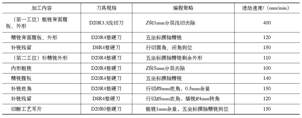 根据零件的技术要求和结构特点分析,本着机床周转尽量少、加工工序尽量少的原则,选用五坐标立式加工中心进行加工,这样整个机械加工过程就能约束在同一台机床上完成,正反面两个工位安排工序就能实现零件全部数控加工到位,实现了装夹、周转次数最小化,能够更好地保证零件的尺寸精度,同时提升整体效率。