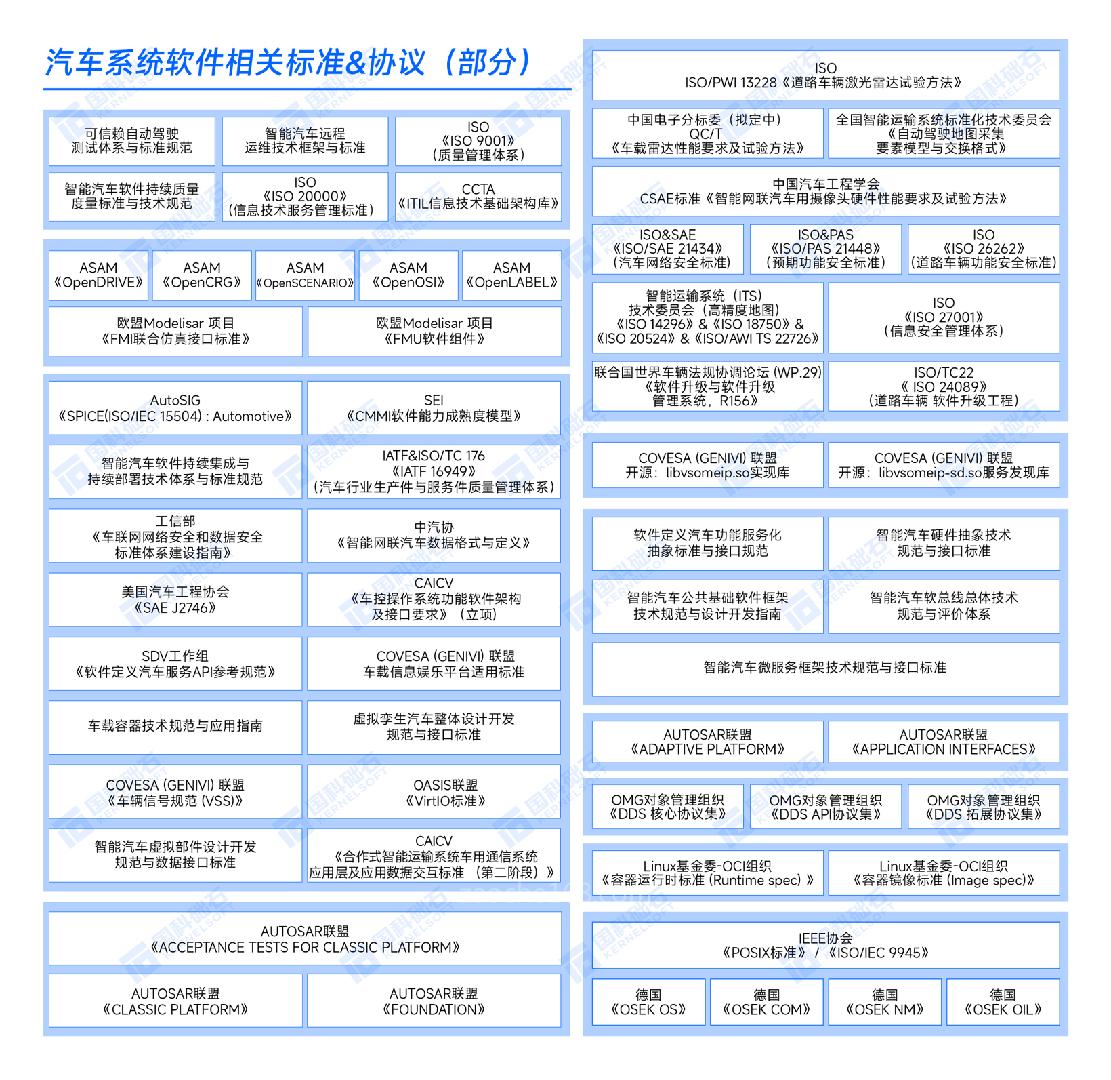 全景图的左侧部分,是汽车软件各个细分子领域中的主要参与厂商和主要产品,是汽车软件的“生态线”;而右侧部分,是汽车软件所需要遵循(以及可能需要制定的)相关国内外标准,是汽车软件的“标准线”。