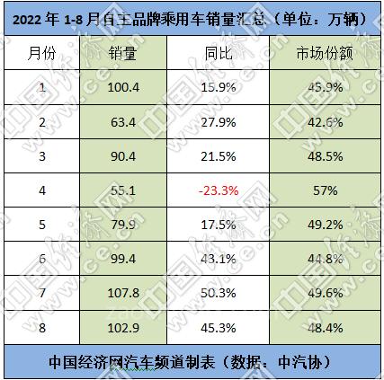 得益于在新能源领域闯出了一条“销量上升、品牌向上”的新路子,自主品牌的销量在今年呈现持续增长的状态。最新数据显示,8月,自主品牌乘用车的销量为102.9万辆,同比增长45.3%,占总量的48.4%;前8个月累计销售699.8万辆,同比增长24.5%,市场份额为47.8%。