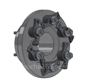 1)夹具体 如图6所示,夹具体与机床连接的法兰尺寸要根据机床主轴端尺寸配制。安装定位心轴的6个孔的圆周尺寸和安装6个菱形销的孔的位置,要根据加工圆弧的半径尺寸和位置要求精确计算后确定[1,2]。