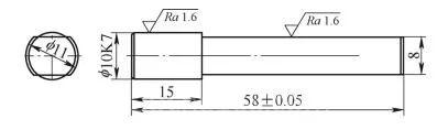 3)菱形销 如图8所示,菱形销与工件定位孔采用小间隙配合,既要保证安装方便,又要限制工件有尽量小的转动量。菱形销与夹具体的装配采用φ10H7/n6的过盈配合,保证菱形销牢固地固定在夹具体上。需要注意的是,菱形销在夹具体上安装时,菱形销的窄面应垂直于菱形销中心和工件锥形孔中心连线。