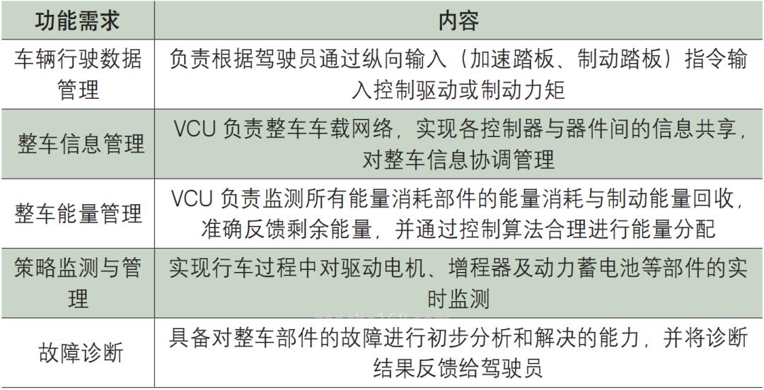 整车控制系统必须满足表1的功能需求。VCU为满足以上功能需求,需满足以下要求: