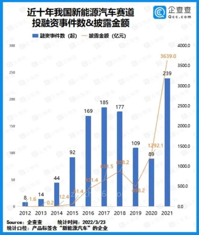 根据企查查的数据,2021年新能源车赛道共完成239起投融资事件,公开披露的融资金额合计达到3639亿,两个数据都创下历史巅峰。