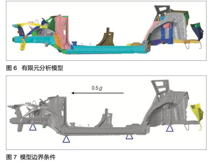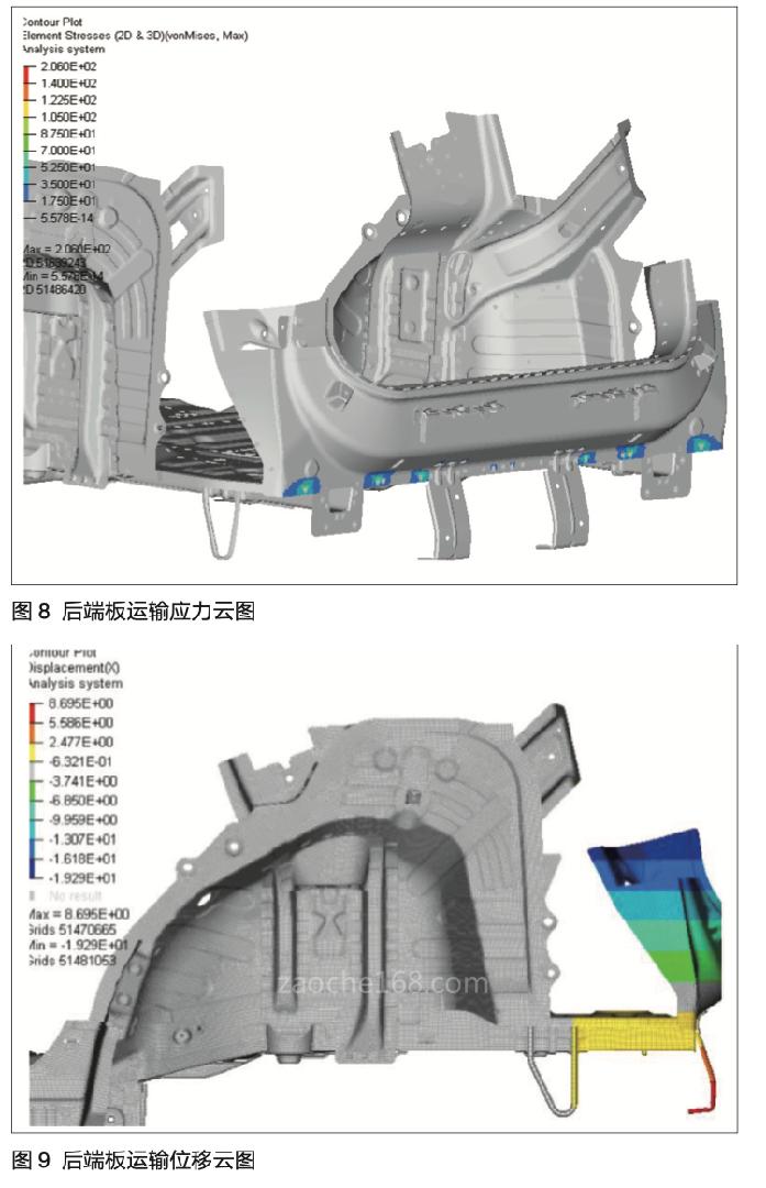 一般来说,图4和图5由于增加了后端板上部连接,整体连接分布较均衡,在制造过程中,后端板与下车身连接强度较好。图3的连接形式由于结构设计原因,连接分布在底部,为确保其连接强度满足车身制造过程中机运运输变形的要求,在车身工艺前期同步工程中,采用有限元仿真方法对其制造过程中的连接强度进行分析,并根据分析结果指导结构改进和优化,使其满足制造要求,避免制造过程中零件发生永久变形,防止零件后期更改造成零件修模等成本的增加。
