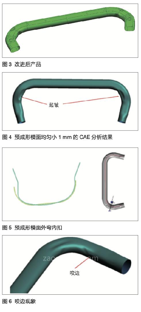 1)内弯起皱明显,如图4所示。这是不能接受的。但在CAE分析过程中我们不断调整R角处弯管半径和圆心位置,分析发现,弯管形状越靠近预成形内弯面,起皱现象越不明显,也就是弯管和预成形时在内弯处尽量接近终成形形状使其变化最小,起皱状态越好。