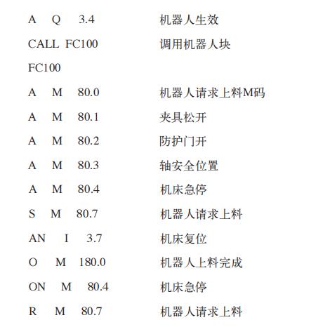 此种编程方法在调用机器人生效并执行机器人上料指令后,没等机器人上料完成就将机器人调到失效状态,然后复位进行机床操作。此时操作人员认为机器人调用失效,机器人不会有动作,其实,当机器人调用失效后,FC100块即失效,再复位也不执行,已经置位的机器人请求上料信号也不能复位,此时机器人还会给机床上料,会造成非常严重的后果。