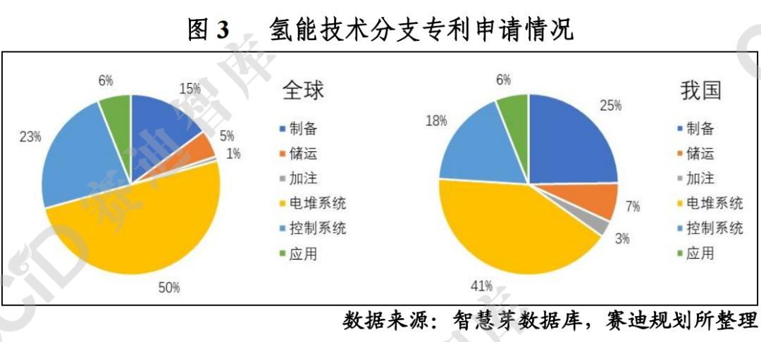燃料电池系统是全球氢能专利申请的主导领域,我国氢能上游技术专利布局较多。氢能产业链上游技术主要包含氢气制备、储运、加注;中游技术主要是燃料电池系统,包含电堆系统和控制系统;下游技术涉及具体应用,比如交通运输、发电、便携式电池、航天领域等。从全球氢能技术分支专利申请情况看,氢气制备、储运、加注三项上游技术,分别占比15%、5%和1%,总计占比21%,电堆系统和控制系统技术总计占比73%,下游应用技术占比6%,氢燃料电池及其在交通运输中的应用已成为全球关注的重点。我国的氢能技术专利分布和全球结构类似,中游燃料电池系统专利申请量最高,总计占比59%,低于全球水平。上游技术专利申请量高于全球水平,总计占比35%,其中氢气制备单项技术的占比可达25%。强大的制氢能力为我国氢能发展提供了坚实保障,传统能源企业纷纷转型布局氢能产业。