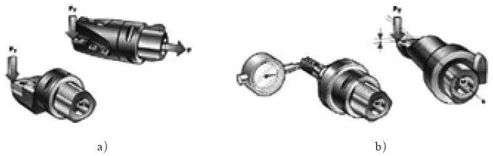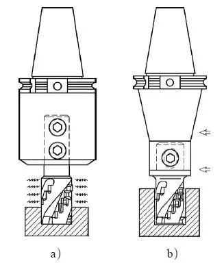 2. CLICKFIT模块式夹持系统提升刀具性能 图12为侧固式夹持与CLICKFIT模块夹持的对比:被加工材料为合金钢,切削速度vc=90mm/min,每齿进给量fz=0.15mm/z,应用侧固式夹持(见图12a)时,背吃刀量ap=25mm时产生振动,而使用CLICKFIT模块夹持(见图12b),当背吃刀量ap=40mm时,切削仍轻快。