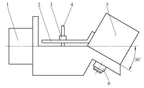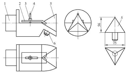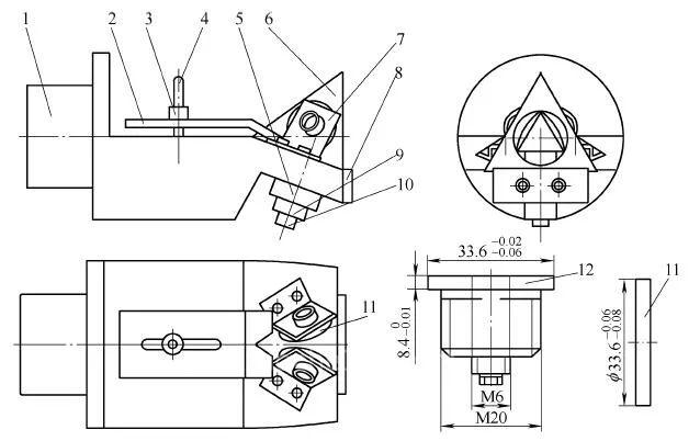 mm,深度8.4mm的圆柱孔,松开螺母3和螺母6将毛坯5旋转120°,找正正三棱锥平面,拧紧螺母3,压紧正压盖2,螺母6固定毛坯5,在第二个正三棱锥平面上车削直径φ33.6