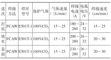 焊接作业前,检查焊接现场条件是否满足焊接工艺评定试验结果的要求,尤其是焊丝、保护气体等。由于焊接时温度较低,所以焊前预热及焊后保温措施应严格按照评定的标准进行[5]。在焊接过程中,应在试弧板上对比调试焊接电流、电弧电压,确保符合工艺评定的要求。