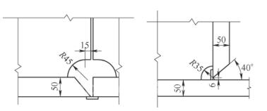 根据15G909-1—2015《钢结构连接施工图示(焊接连接)》[4]确定该工程的H型钢上下翼缘过焊孔的切角构造,如图2所示。热轧H型钢下翼缘上平焊坡口侧腹板与翼缘连接焊缝更近,在热影响区更容易形成应力集中,因此过焊孔大小与加工质量对焊接质量影响较大,此次应控制过焊孔R角半径为45mm。