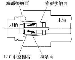 HSK工具系统最突出的特点就是端面和锥面同步接触。夹紧时, 由于锥部有过盈,所以锥面受压产生弹性变形,同时刀柄向主轴锥孔轴向位移,以消除初始间隙,实现端面之间的贴合,这样就实现了双面同步夹紧(见图2)。也就是说,在足够大的拉紧力作用下, HSK1:10空心工具锥柄和主轴1:10锥孔之间在整个锥面和支承平面上产生摩擦,提供封闭结构的径向定位。就其本身的定位而言,这种保证锥面和端面同时定位的方式实质上是过定位,但由于精密制造保证了高的相互位置精度,反而增强了安装刚性。这种定位的优点为: