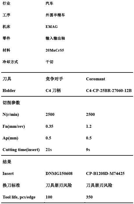 汽车行业的加工,分秒必争,通过采用山特维克可乐满全新的CoroTurn PrimeB刀具,给客户带来了极大的竞争优势,刀具寿命较常规通用系列提升250%,单刀片切削时间节省12s,同时避免了操作工中途加工换刀的麻烦,可以实现一班一换,山特维克可乐满新方案的应用成果在客户处获得了极高的评价。