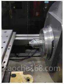 由于喷注器内栓的端面是四方结构,不利于后续的装夹定位,故设计专用固定工装。此工装的装夹部分与端面的垂直度有严格的几何公差要求,需保证在0.008mm以内,同时工装与内栓贴合的端面平面度也应该保证在0.01mm以内;专用工装前端加工一凸台,凸台外圆与工装的装夹部分需保证同轴度0.008mm以内的要求,同时凸台外圆与内栓零件内孔严格配加工,装夹时依靠凸台定位,通过螺钉紧固,保证装夹后工装的装夹部分与固定在工装上的内栓加工微槽结构的外圆同轴度要求。内栓零件专用工装装夹如图4所示。