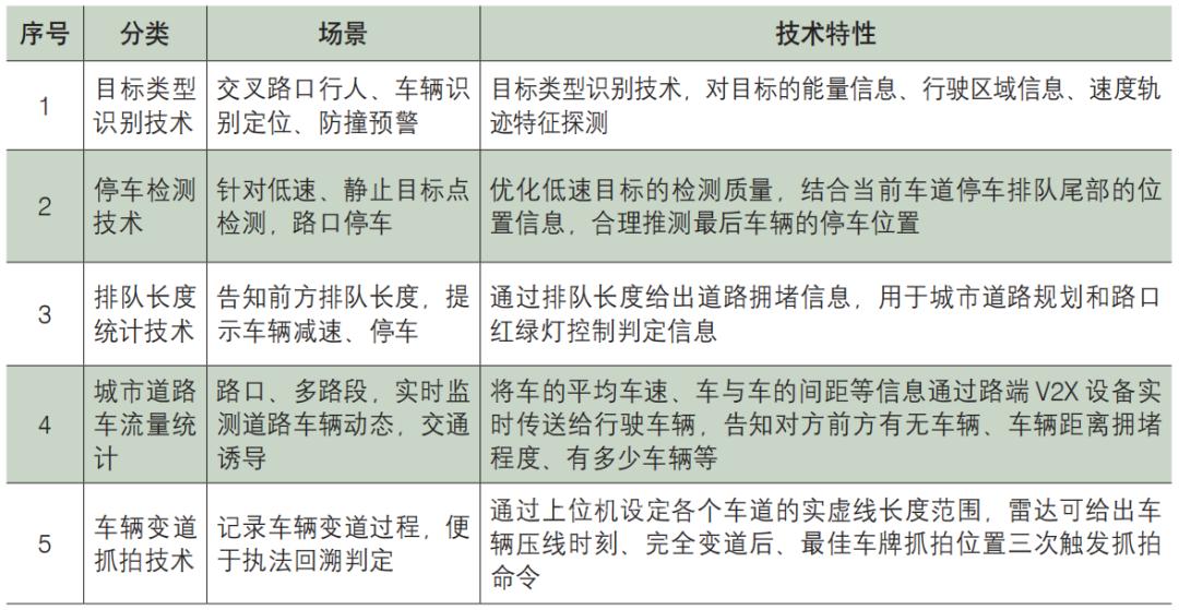 毫米波雷达在路端的应用,主要体现在智能汽车交叉口通行车路协同控制技术中。在车路协同场景中,4D雷达与摄像头融合,可实现同时对各种移动和静止的大小车辆、自行车、行人以及其他目标进行分类和追踪。它尤其擅长于在大规模复杂路口、人车流混杂的车路协同场景应用,包含传统的智能交通功能、事件检测和车流量统计等。它一般安装在高清摄像头旁边,由V2X(车路协同控制系统)将信号传出去。具体应用场景见表2。