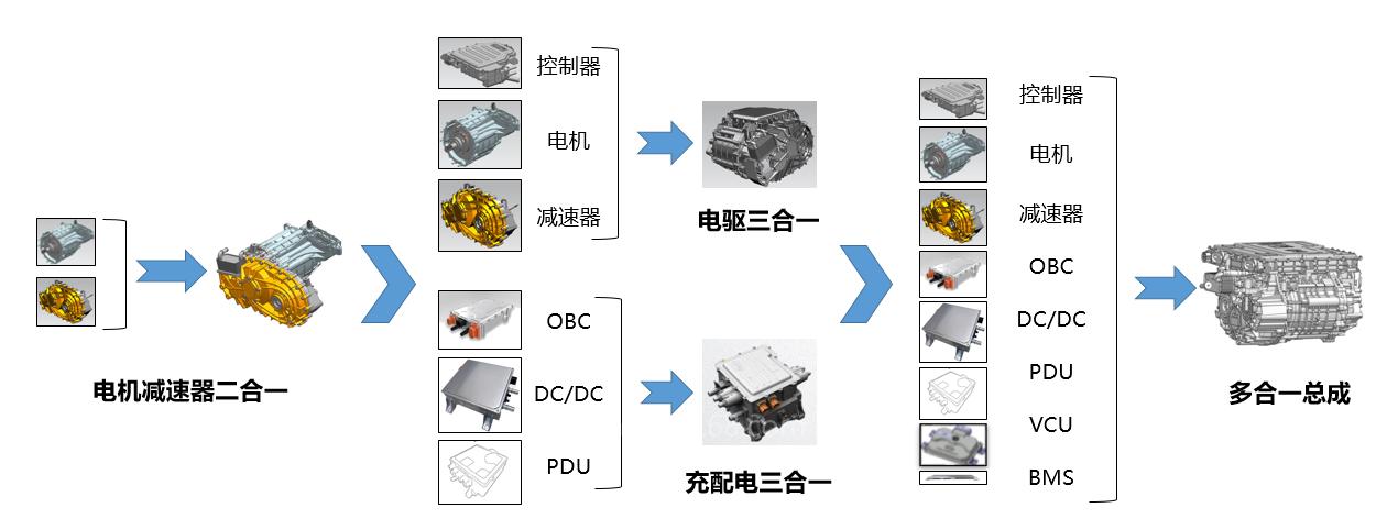 具体来看,集成方案的演变大概如下:二合一是减速器+电机,后来发展为“3+3”,也就是电驱三合一+充配电三合一:控制器+电机+减速器+OBC+DC/DC+PDU,根据整车厂需求决定里面的内容,软件基本上由整车厂来协调控制。而多合一总成是控制器+电机+减速器+OBC+DC/DC+PDU+VCU+BMS。