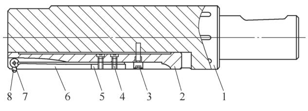 弹簧片压紧式去毛刺刀具结构如图5所示,主要由硬质合金刀片、销轴、弹簧片、紧固压条、螺钉、刀杆及刀体组成。刀片可绕轴旋转,弹簧片产生的弹力保证切削过程中切削刃压紧环槽棱边(工件毛刺部位),定点清除毛刺。弹簧片压紧、刀片可转动式刀具实物如图6所示。