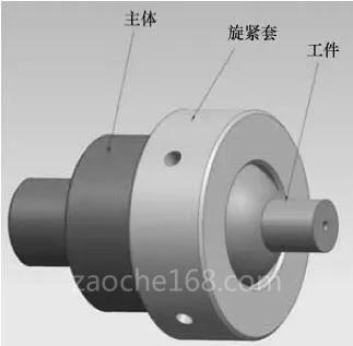 加工工艺方案如下:车削一个带夹头φ30mm、直径φ80mm的球体零件(见图1-137),φ30mm夹头端面上保留中心孔,采用UG绘图取点测量出球体顶点距离球体直径表面上同一平面内的5个正十二面体的距离是22mm,上下相邻不在同一平面球体表面上5个圆柱孔平面间的距离是36mm,用万能分度头夹住φ30mm直径,在球体上划十等分线,卸下工件,将夹头中φ30mm的平面放在平台上,用游标高度卡尺测量距离球顶22mm处划圆,调整游标高度卡尺,下降36mm,在球体表面划圆,用点冲在球体表面上取球体表面上十二个圆柱孔的中心点。将收点后的球体工件装入图1-138所示的夹具中,用顶尖顶持φ30mm端面的中心孔,顶正工件,拧紧旋紧套(见图1-139)。移除顶尖,去除φ30夹头,以球体表面为测量基准,依次车削台阶孔,尺寸分别为φ39mm孔深10.7mm、φ29mm孔深7mm、φ19mm孔深7mm、φ9mm孔深7mm。加工完毕后在台阶孔内用胶枪注入热熔胶,松开旋紧套,旋转工件180°,用尾座顶尖的尖点找正球体上点冲位置,锁紧旋紧套,按类似方法车削台阶孔并注入热熔胶,同理,依次加工球体表面上的12个正十二面体的台阶孔(见图1-140)。加工完毕后取下工件,将工件放入沸水中,融化热熔胶,用专用工具清除热熔胶,去除飞边,加工完毕(见图1-141)。