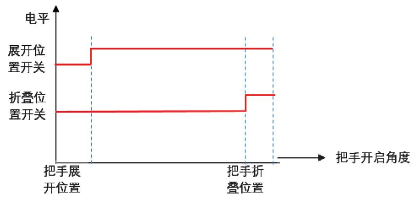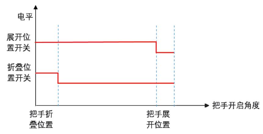 在把手结构设计时,应对把手折叠、展开状态进行精确监控控制,常用的状态监控元器件有微动开关、霍尔传感器等。为了避免堵转工况、降低结构损伤及考虑手柄动作一致性要求,推荐在把手折叠和展开两种状态下至少布置两个微动开关进行确认检测控制,如图1~图3所示。