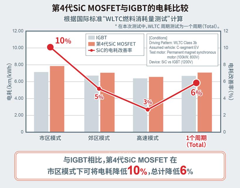 2020年完成开发的新一代碳化硅MOSFET(第4代),改善了短路耐受时间,并实现了业界超低的导通电阻。在车载逆变器中采用该产品时,与使用IGBT时相比,电耗可以减少6%(按国际标准“WLTC燃料消耗量测试”计算),非常有助于延长电动汽车的续航里程。目前,除了裸芯片之外,还正在开发分立封装产品,在此次的共创项目中,罗姆计划开发并提供内置这种最新碳化硅MOSFET(第4代)的功率模块。