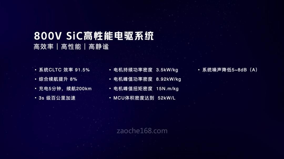 浩智800V SiC高性能电驱系统,其电机峰值功率250Kw,电机最高转速21000rpm,电机最大扭矩420N▪m,最大输出扭矩4600N▪m,百公里加速达到3s级;适用于400V中压平台和800V高压平台,整车只需充电5分钟,就可续航200km,综合续航提升8%;同时,系统噪声降低5-8分贝。
