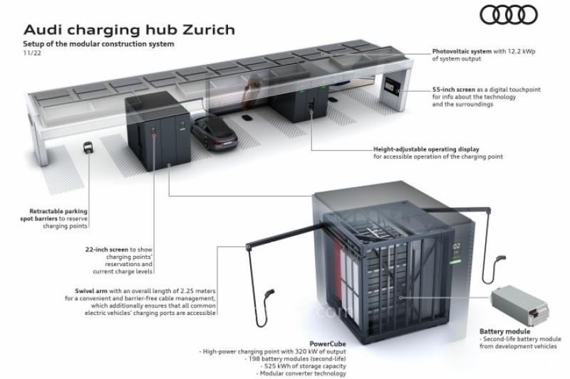 近日,奥迪于瑞士苏黎世正式启用全球第2座充电站,站内提供4组高功率充电桩,每组充电设备最高输出功率达320kW,合计能储存1.05MWh电力,相当于11辆奥迪e-tron 55车型的储存容量,每日预计将能够提供60辆电动车充电,且奥迪车主可以通过手机App提前45分钟预约充电枪。