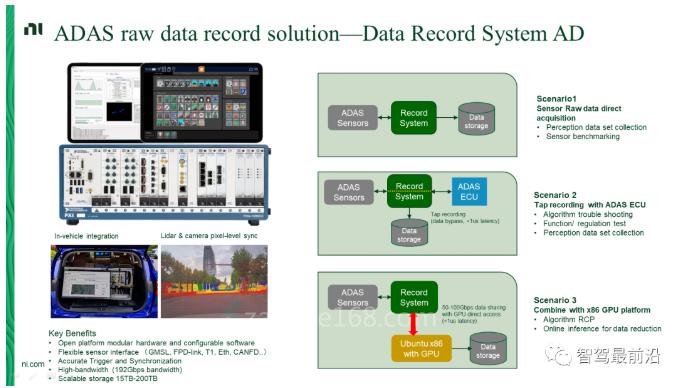 NI提供的基于PXI平台的模块化数据采集方案,可以满足多路摄像头、车载以太网、CAN/CANFD、GPS等的数据采集,还能满足不断阶段的数据采集需求。比如,ADAS域控制器已经基本在研发和迭代的阶段,可以通过数据旁通采集的方法,将NI测试设备作为一个中间件,从中间把数据采集回来,这样就不会破坏掉传感器到ECU的数据链路。此外,NI的解决方案支持15TB~200TB的数据存储容量。