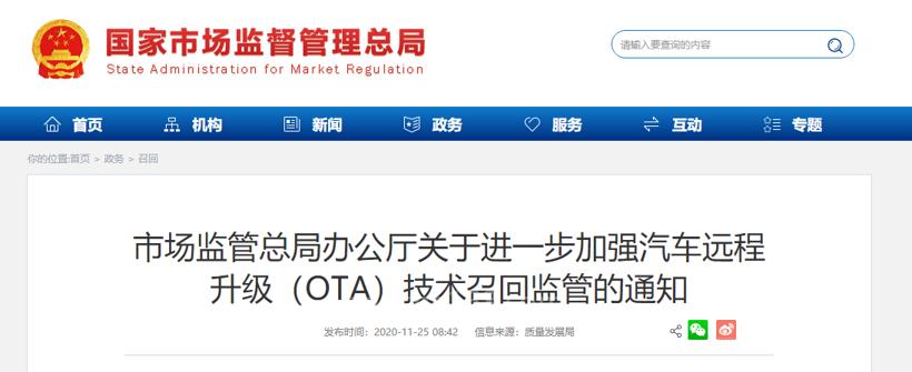 2020年11月,市场监管总局发布“关于进一步加强汽车远程升级(OTA)技术召回监管的通知”。为规范OTA技术的使用,通知提出生产者采用OTA方式对已售车辆开展技术服务活动的,应向市场监管总局质量发展局备案;采用OTA方式消除汽车产品缺陷、实施召回的,应制定召回计划,向市场监管总局质量发展局备案等要求,从而杜绝生产者采用OTA方式隐瞒车辆缺陷、规避召回等。