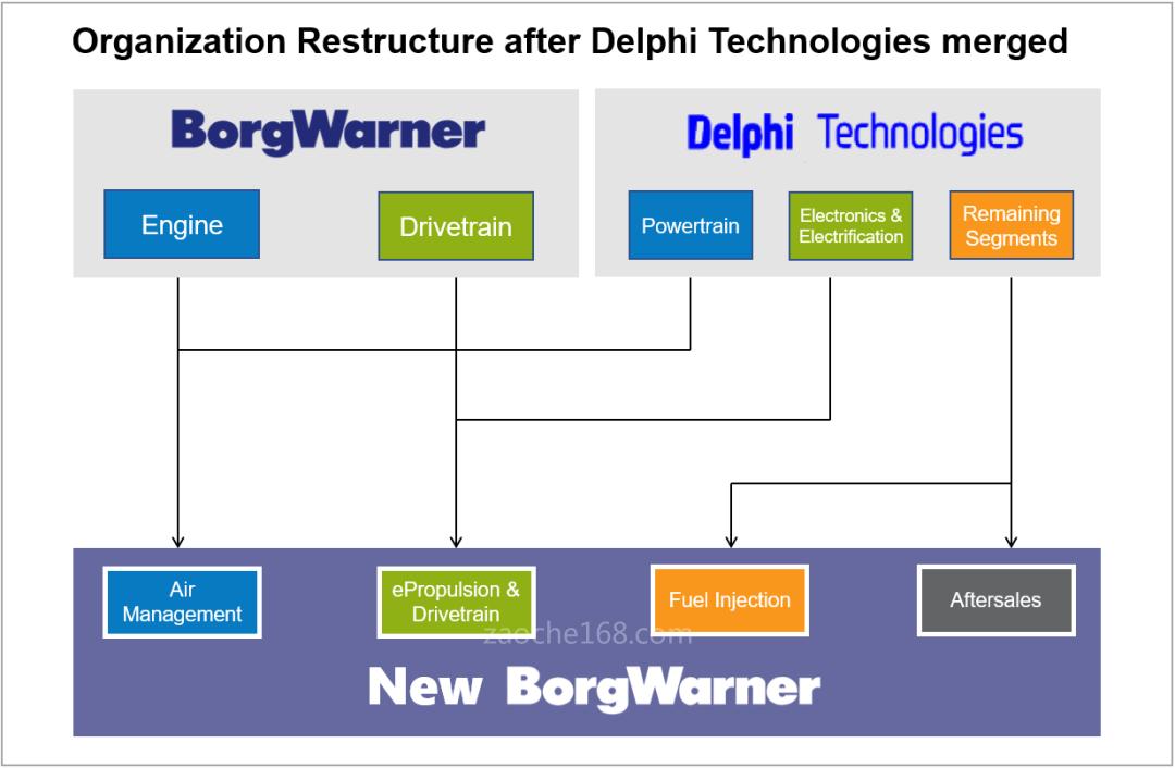 据了解,博格华纳现有的四大业务板块格局,是在2020年10月完成收购德尔福科技后重编而成的。原本博格华纳拥有发动机和传动系统两大子集团,架构调整后,博格华纳的发动机子集团更名空气管理事业部,并吸纳德尔福科技的动力总成业务;博格华纳的传动系统子集团更名电驱动及传动事业部,并吸纳德尔福科技的电子与电驱动业务。至于德尔福科技余下的业务则一分为二,其中发动机电喷系统业务成为博格华纳的燃油系统事业部,另一部分则为售后市场事业部。