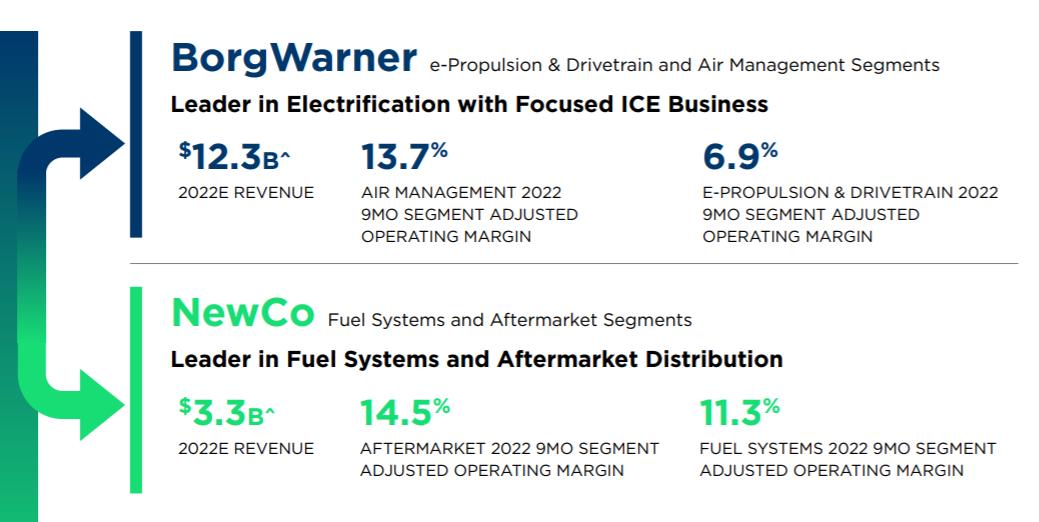 也就是说,博格华纳此次要拆分出去的两个部门,其实是原德尔福科技的部分业务。从业绩来看,今年前三季度,燃油系统部门的营收为17亿美元,调整后营业利润率为11.3%;售后市场部门的营收略低于10亿美元,调整后营业利润率为14.5%。博格华纳预计,2022年全年,这两个部门的营收合计将为33亿美元。