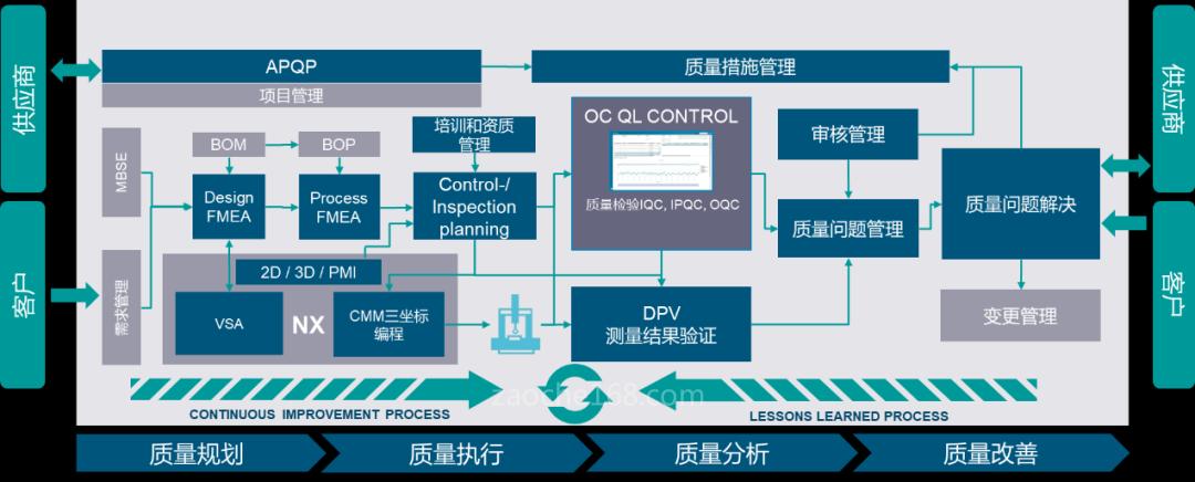 西门子认识到质量管理的价值必须从传统的制造质量优先前移到研发端,形成从研发端建立以客户需求出发进行的质量策划APQP,再到产品设计、工艺设计FMEA风险分析以及质量要求的识别、传递,在执行端进行质量执行后反馈给研发端的完整闭环管理模式,打破工程、制造和质量部门之间的信息孤岛。
